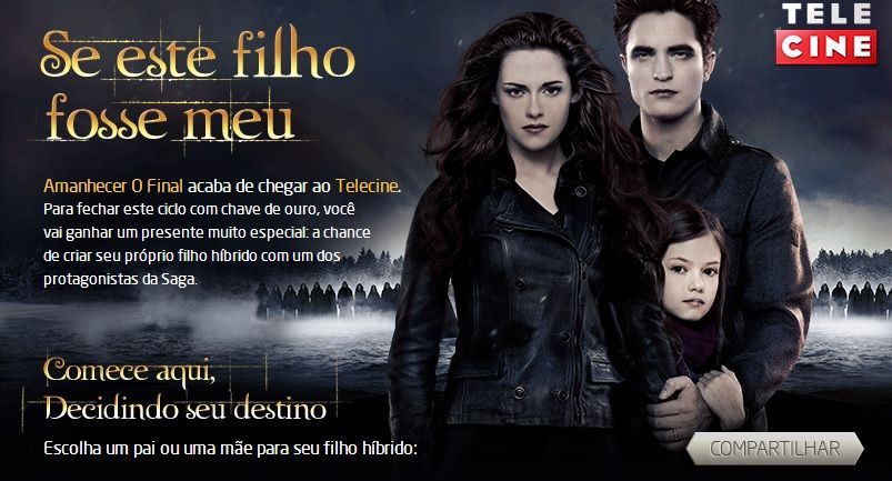 Já pararam pra pensar como seria um filho de vocês com Bella, Edward ou Jacob? Em uma ação super bacana para promover o lançamento de Amanhecer – Parte 2 na TV, a Rede Telecine criou um aplicativo para Facebook que permite que os fãs descubram a resposta para essa pergunta. Em Se este filho fosse meu basta subir uma foto sua, de rosto, e escolher quem seria o pai do seu filho. O aplicativo gera uma imagem com o resultado. É possível, também, escolher o sexo da criança. Demais, né? Curtiram a ideia? Para participar, basta CLICAR AQUI !